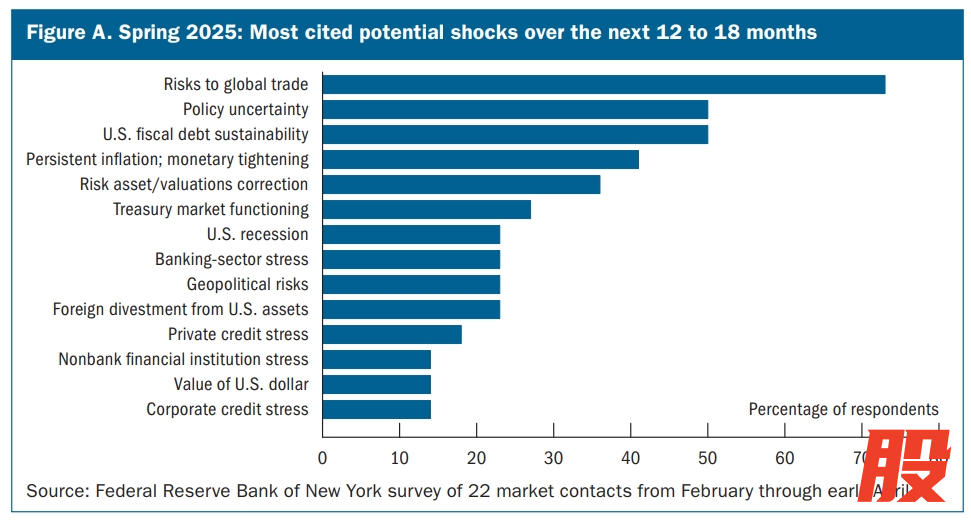 美联储4月25日公布的最新金融稳定报告显示,全球贸易风险上升、总体政策不确定性以及美国债务的可持续性高居美国金融体系潜在风险的榜首。73%的受访者表示,全球贸易风险是他们最担心的问题,这一比例是11月份报告的两倍多。半数受访者认为,总体政策不确定性是最令人担忧的问题,这一比例较去年同期有所上升。调查还发现,与近期市场动荡相关的问题受到了更多关注,27%的受访者担心美国国债市场的运转,高于去年秋季的17%。外国对美国资产的撤资和美元的价值也在担忧名单上上升。