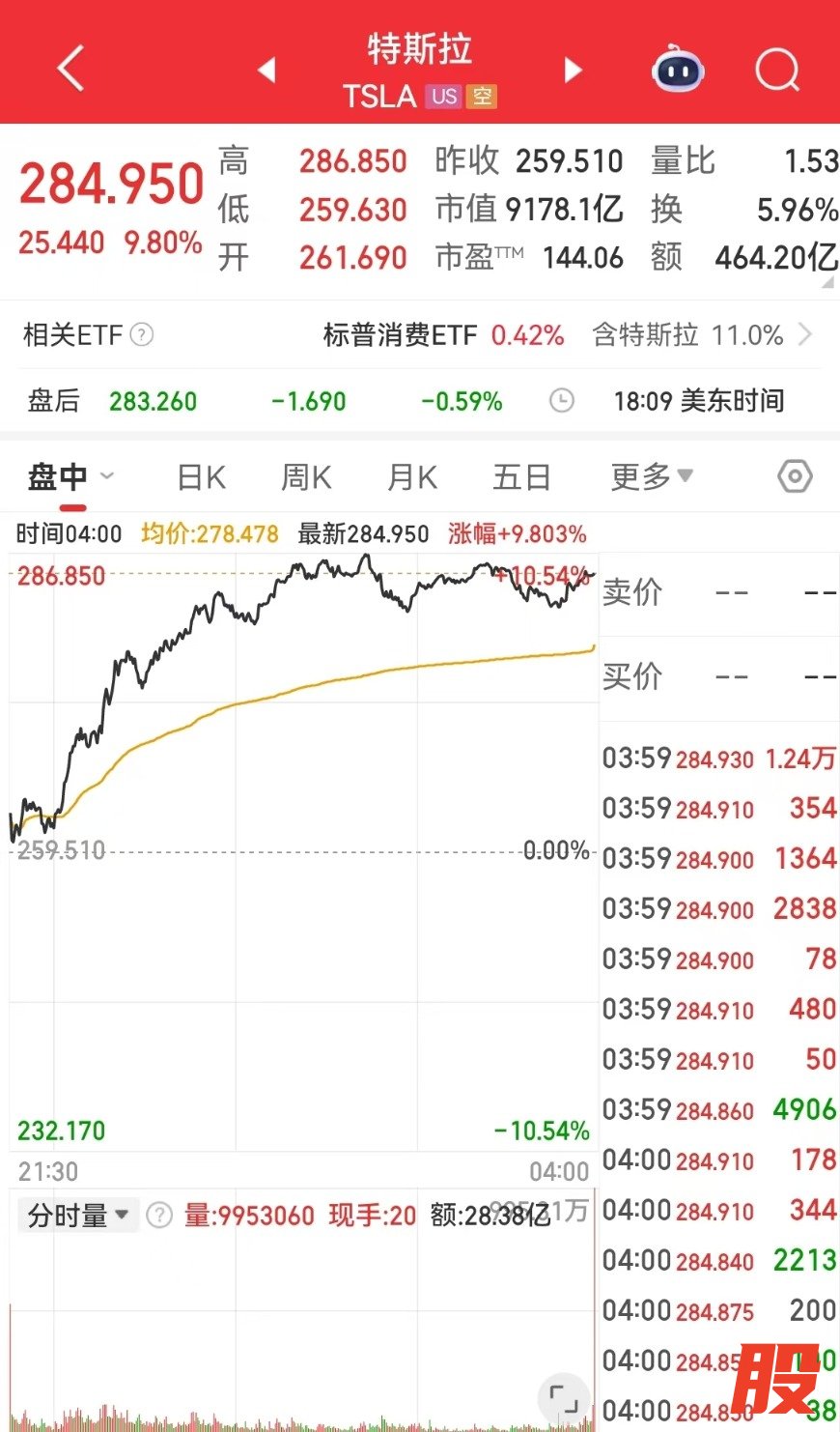 特斯拉涨9.80%,报284.95美元,最新市值9178.1亿美元,其市值一夜增加超819.4亿美元(约合人民币5972亿元)。