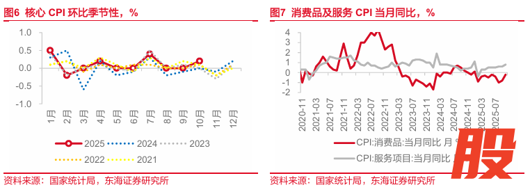 核心CPI趋势性向好。10月核心CPI环比0.2%,强于季节性,同比1.2%,继续保持稳定回升。服务价格短期受双节出行增加的影响,从年内趋势上来看也持续回升。消费品价格一方面同样受到金价上涨的影响,另一方面,文娱耐用消费品和家庭日用杂品价格涨幅在2.4%-5.0%之间,燃油小汽车降幅也有所收窄。