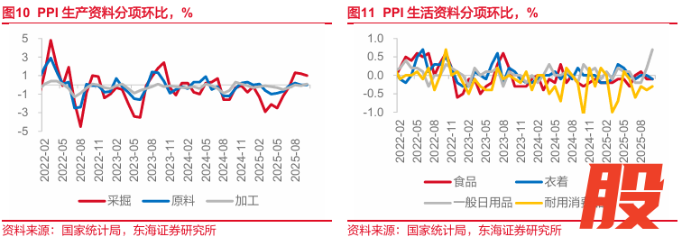 10月PPI的两个特征。分行业来看,一是上游能源的价格分化,冬储补库及用电需求增加,煤炭开采和洗选环比1.6%,同比-15.6%,降幅继续收窄,但原油受国际输入因素影响,开采和加工环比均下跌。二是中游反内卷的成效进一步体现,光伏设备及元器件制造、电池制造、汽车制造业价格同比降幅分别收窄1.4个、1.3个和0.7个百分点。后续关注5000亿元政策性金融工具落地后对相关需求的带动。