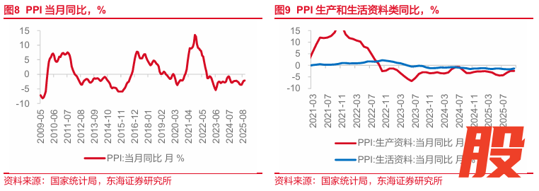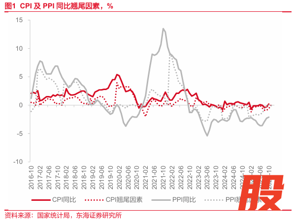 事件:2025年11月9日,统计局发布10月通胀数据。10月,CPI当月同比0.2%,前值-0.3%;环比0.2%,前值0.1%。PPI当月同比-2.1%,前值-2.3%;环比0.1%,前值0.0%。