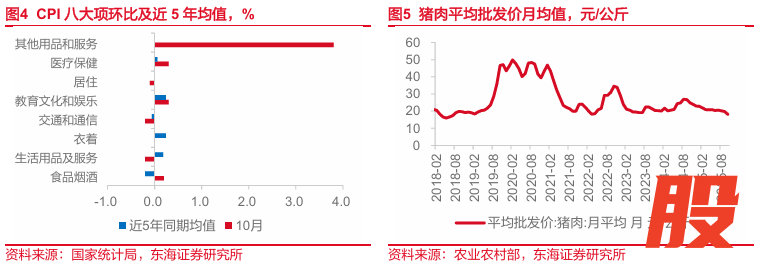其他用品及服务上涨较多,或受金饰品涨价带动。10月非食品价格同比0.9%,前值0.7%,连续5个月回升。7大类分项中教育文化和娱乐、医疗保健、其他用品和服务环比强于季节性,生活用品及服务、衣着、交通和通信、居住弱于季节性。其中其他用品和服务(环比3.8%)大幅强于季节性(近5年同期均值0.0%),或与10月金饰品涨价有关(环比10.2%)。