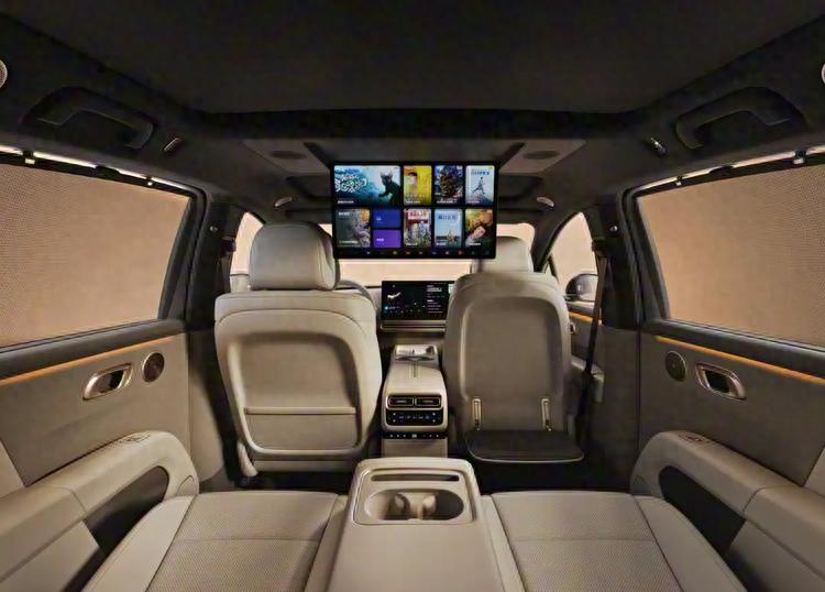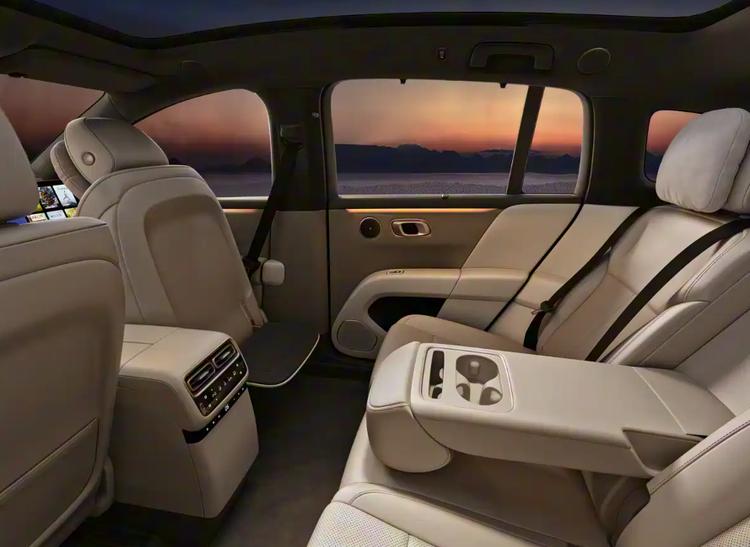 值得注意的是,该屏幕可能非全系标配,未配备吸顶屏的车型将搭载全景天幕并提供电动遮阳帘。车门设计与理想i8较为接近,融入了氛围灯、金属质感扬声器及宽大扶手。后排中央同样配备宽大扶手,副驾座椅支持前移,为右后乘客提供脚托踏板,头枕也做了专属优化。此外,后排还配备了手动侧窗遮阳帘以及冷暖双用冰箱。