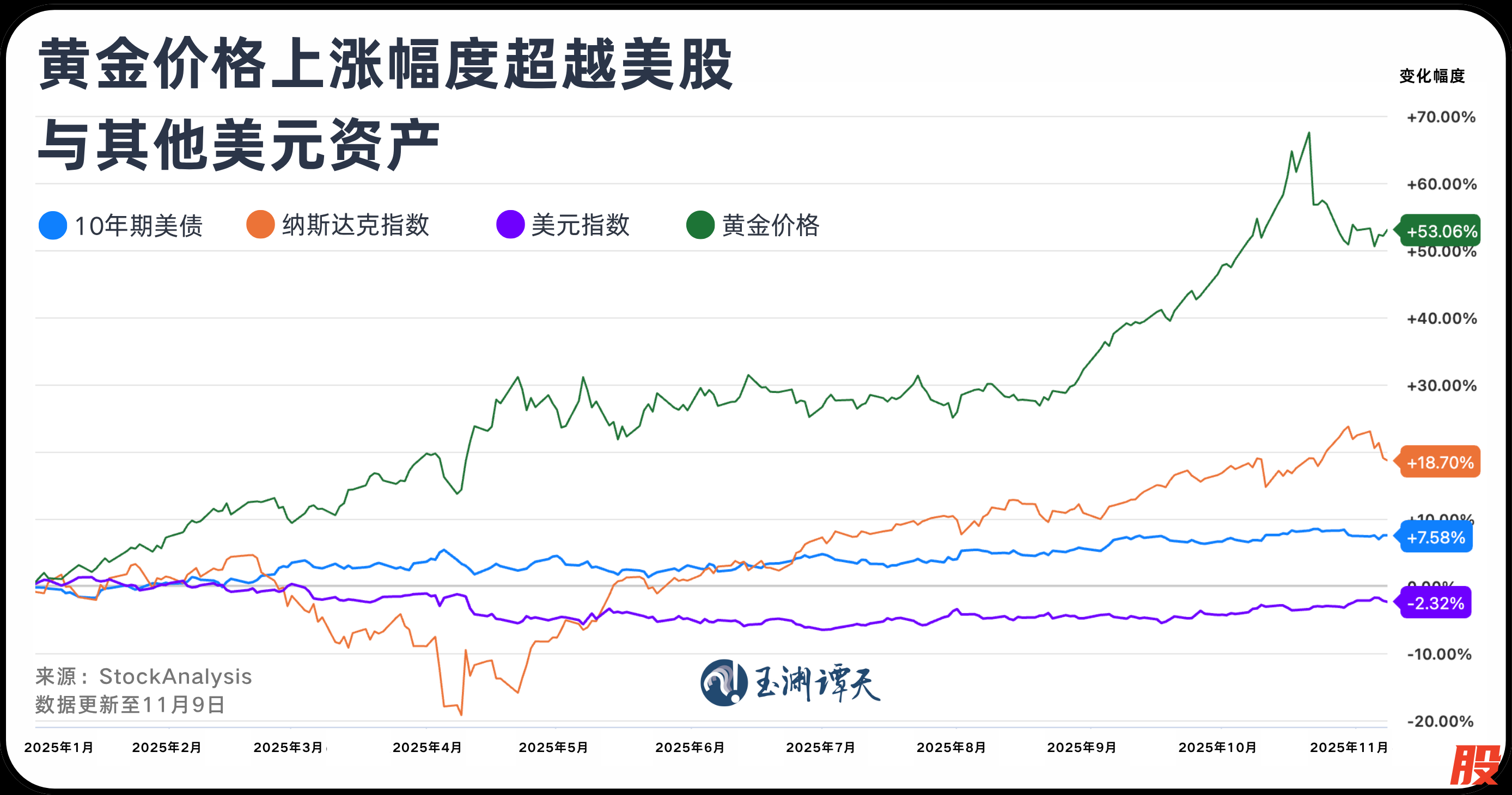 如果再与其他资产对比会发现,今年以来,黄金成了主要资产中涨幅最大的资产类别,甚至超过美股。